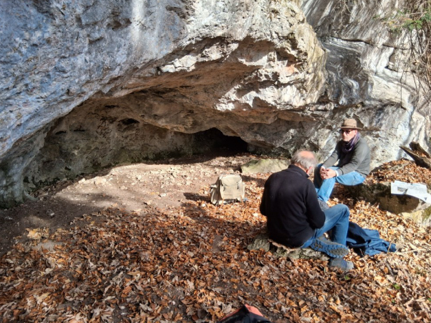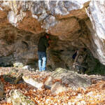 Der Bauer ist zwar gerade am Skilift Hotzenberg zugange, aber seine Frau begrüßt uns sehr freundlich und kann uns den ungefähren Weg zu den vermuteten Bergbau-Stellen oben am Steineberg weisen. Steil und weglos geht’s dann hinauf, und nach einiger Sucherei finden wir auch eine mehrere Meter breite und vorne 2 Meter hohe Höhle, die nach hinten abfällt und vermutlich noch tiefer in den Fels hinein reicht. Dort ist sie allerdings verfüllt mit Erde und großen Felsbrocken. Ohne schweres Gerät ist hier nix zu machen.
