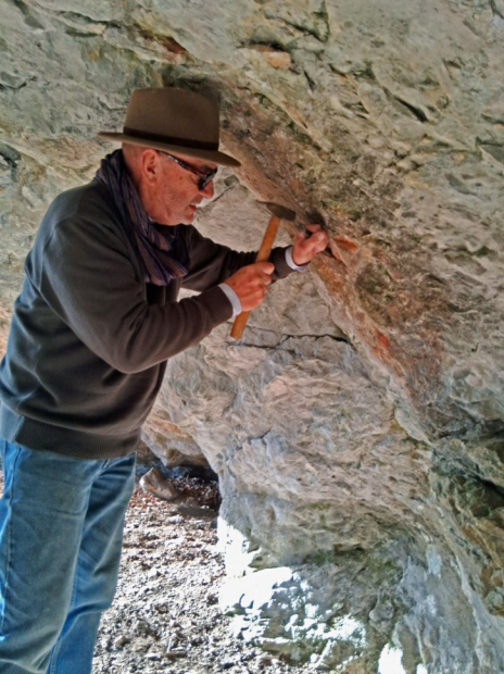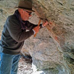 Im für uns zugänglichen Bereich klopfen wir einige Proben ab, ohne irgend eine Spur von Erzen zu entdecken. Diese Höhle ist zwar zumindest teilweise bearbeitet, aber das Wozu bleibt uns unklar. Dafür entwickelt sich zwischen Alfred und Matthias wieder eine tiefgründige Diskussion über die Genese der Rothplattenbach-Gesteine (Spilit, Basalt, mit Analcim, Tridymit, Umwandlungen, eruptiver CO2-Ausgasung, dazu Alfreds Röntgen-Analysen, …; als geologischer Laie muss der Chronist hier passen).