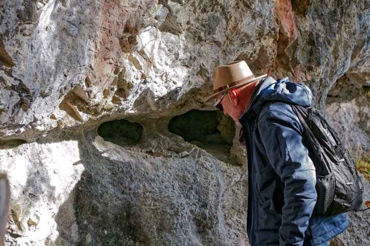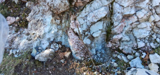 Zur mentalen Entspannung geht’s dann noch weiter aufwärts. Da soll sich ein weiteres tiefes Loch befinden. Diese Stelle finden wir auch. Allerdings stellen sich die in einer horizonalen Zone liegenden Löcher als Karst-artige Auswaschungs-Hohlräume heraus, also ebenfalls ohne jede Vererzung.